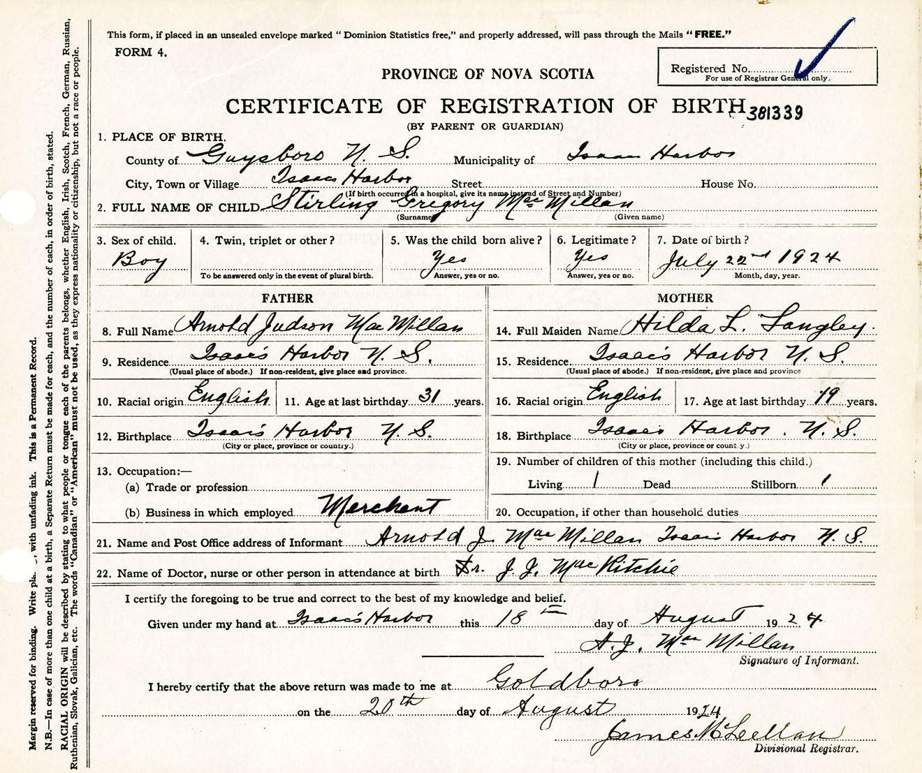 Male Birth Registration: Year: 1924 number: 38100339