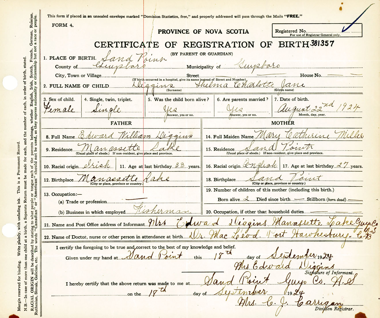 Female Birth Registration: Year: 1924 number: 38100357