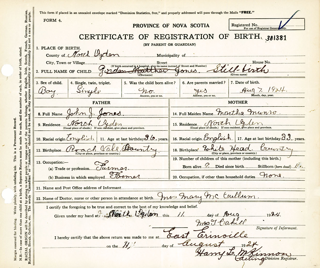 Male Birth Registration: Year: 1924 number: 38100381