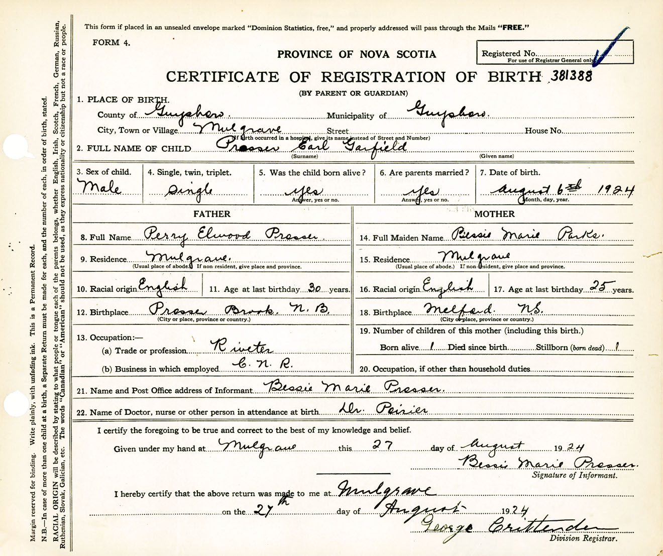 Male Birth Registration: Year: 1924 number: 38100388