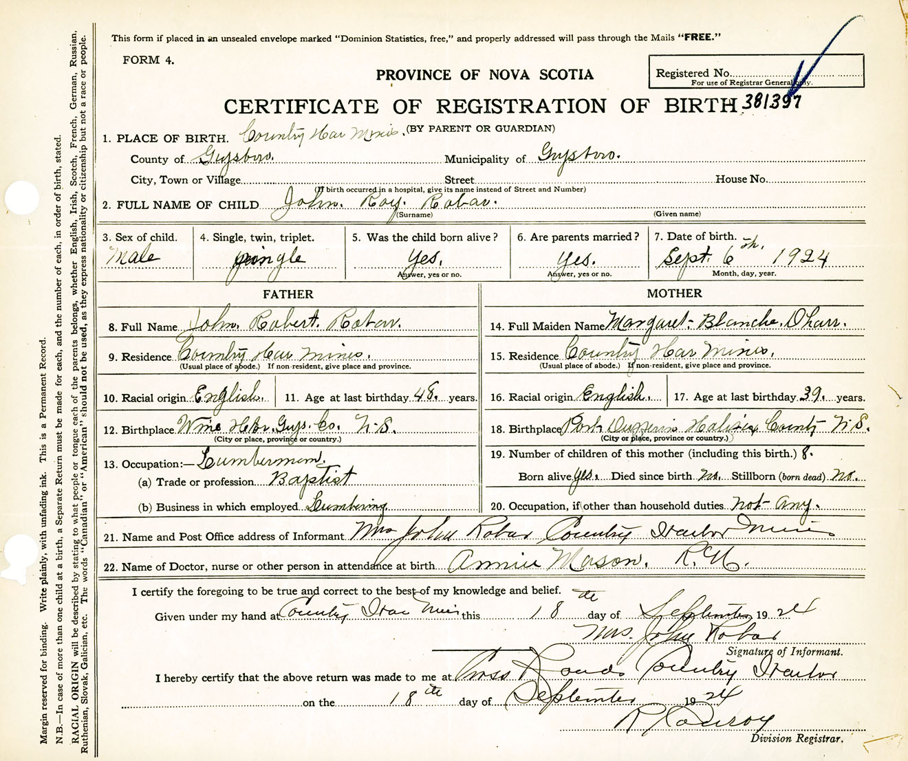 Male Birth Registration: Year: 1924 number: 38100397