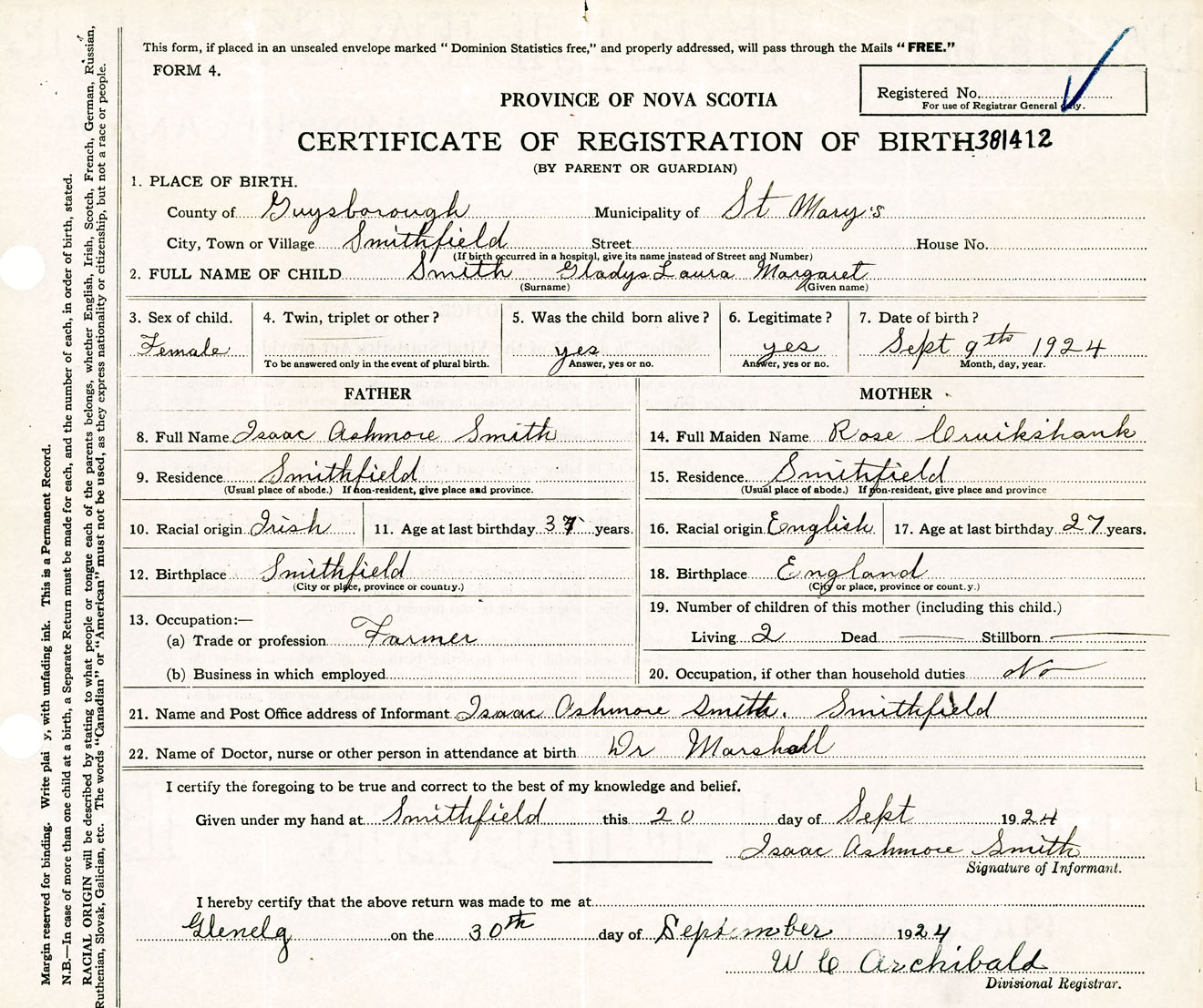 Female Birth Registration: Year: 1924 number: 38100412
