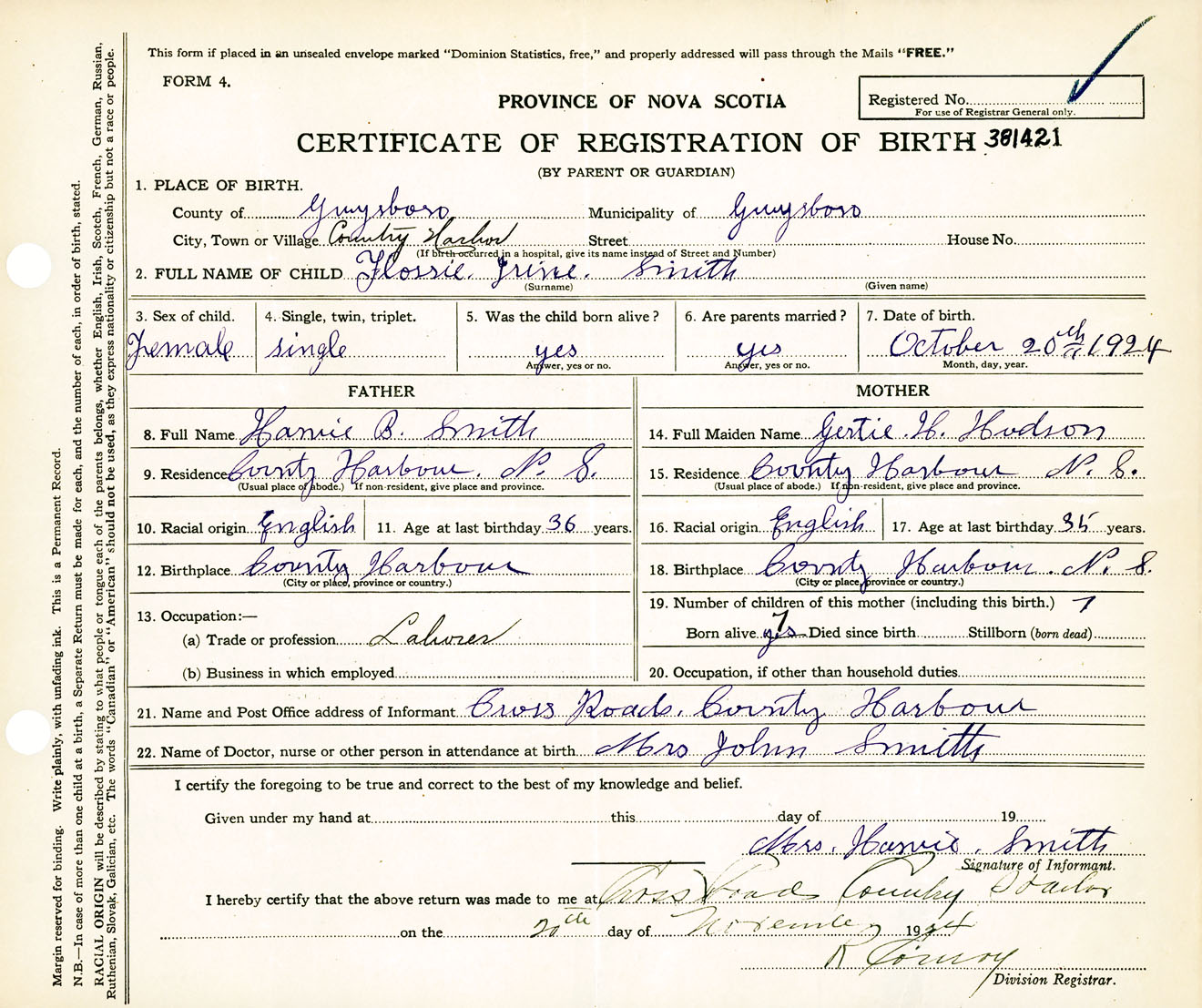 Female Birth Registration: Year: 1924 number: 38100421
