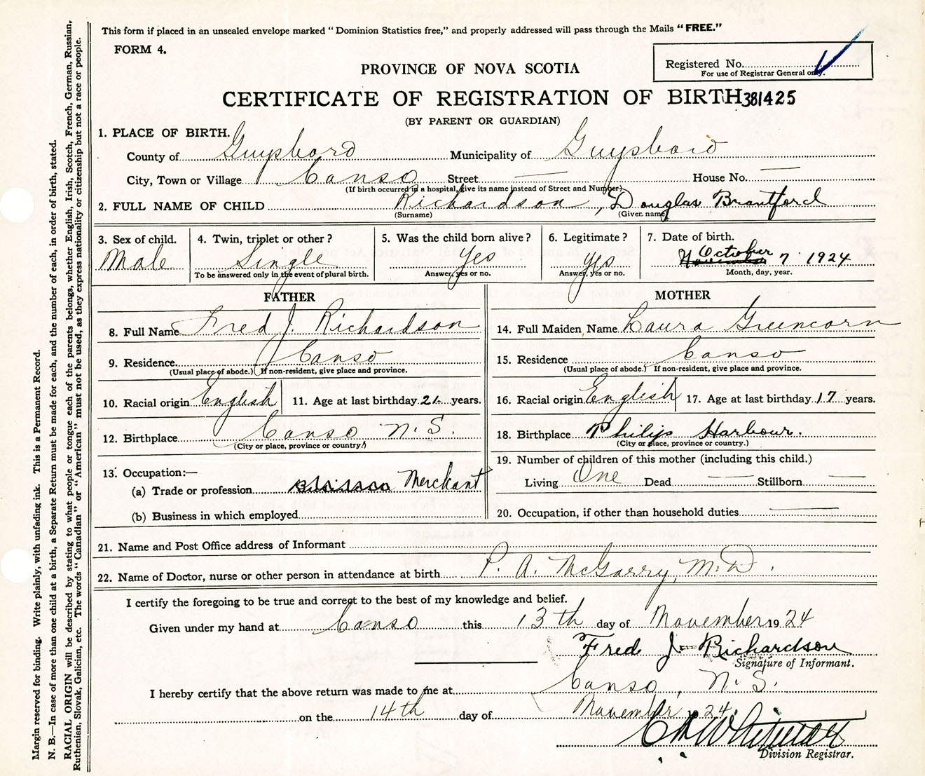 Male Birth Registration: Year: 1924 number: 38100425
