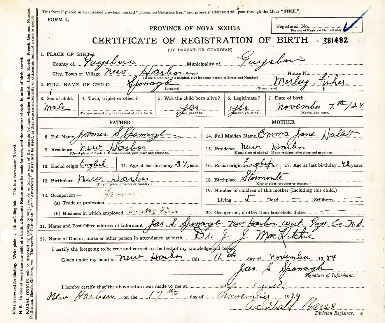 Male Birth Registration: Year: 1924 number: 38100482