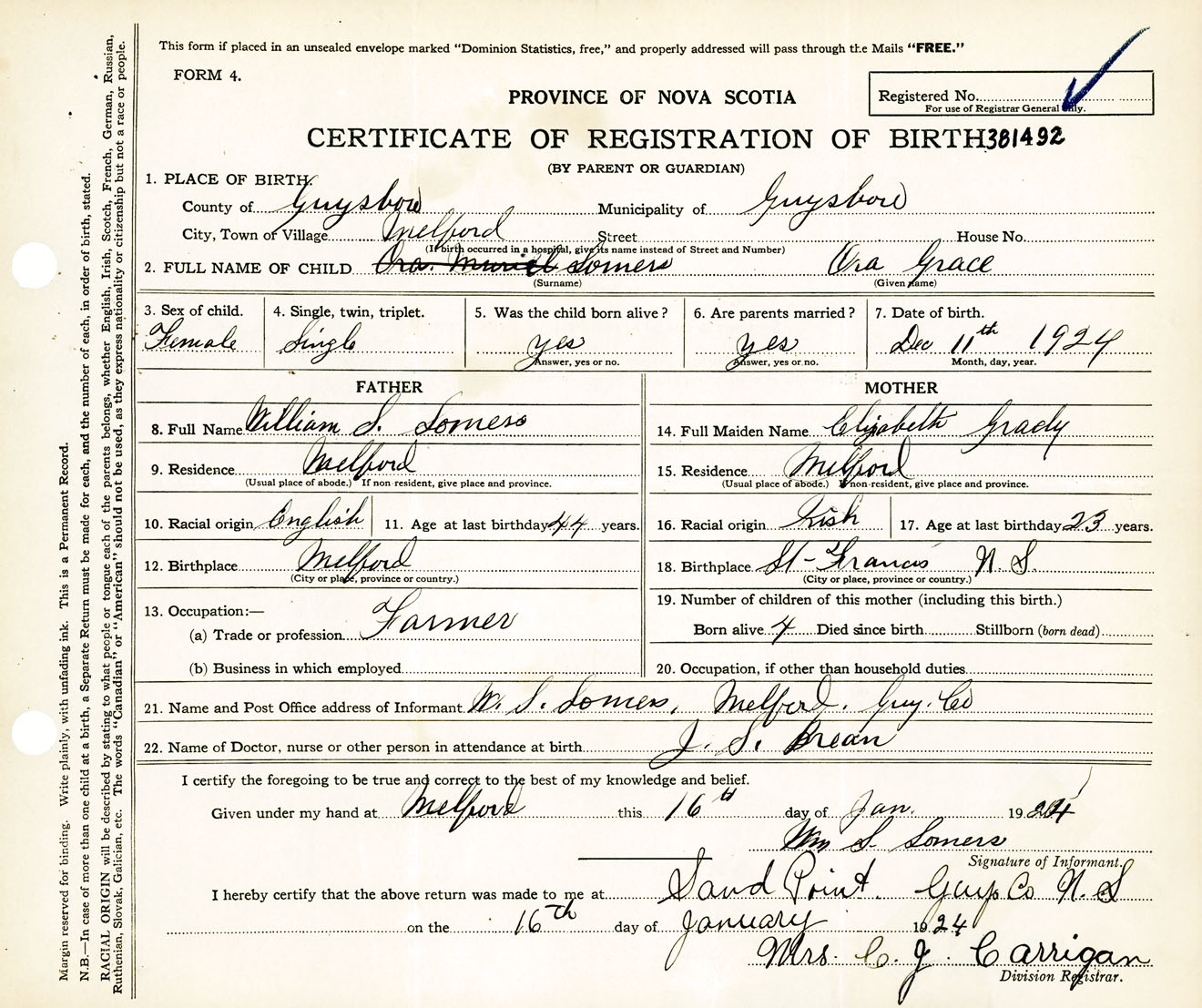 Female Birth Registration: Year: 1924 number: 38100492