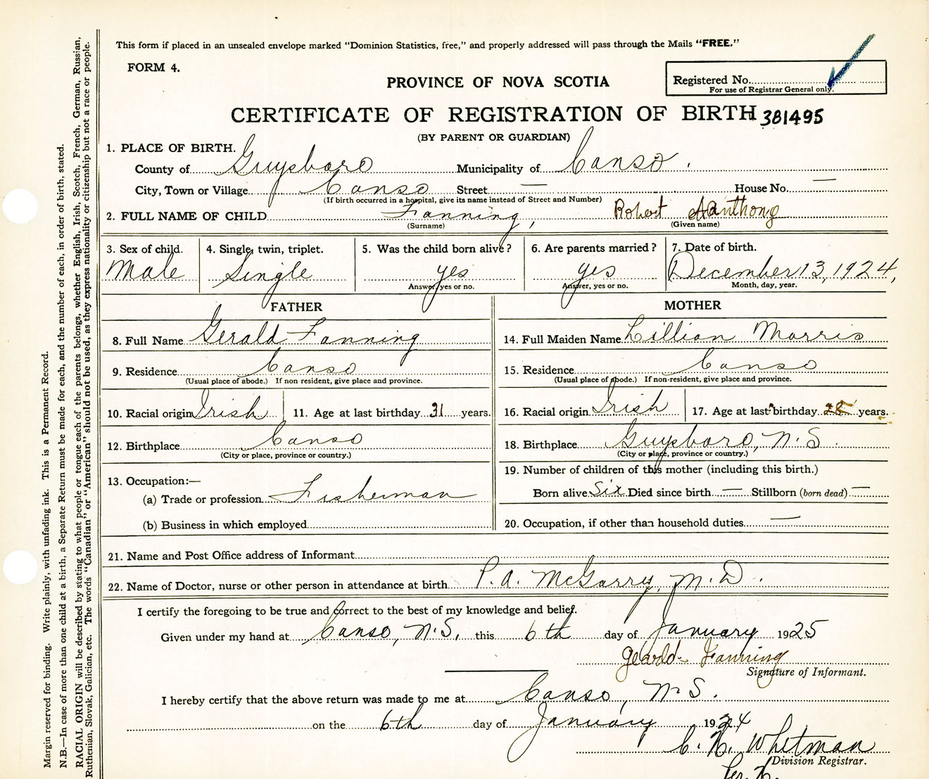 Male Birth Registration: Year: 1924 number: 38100495