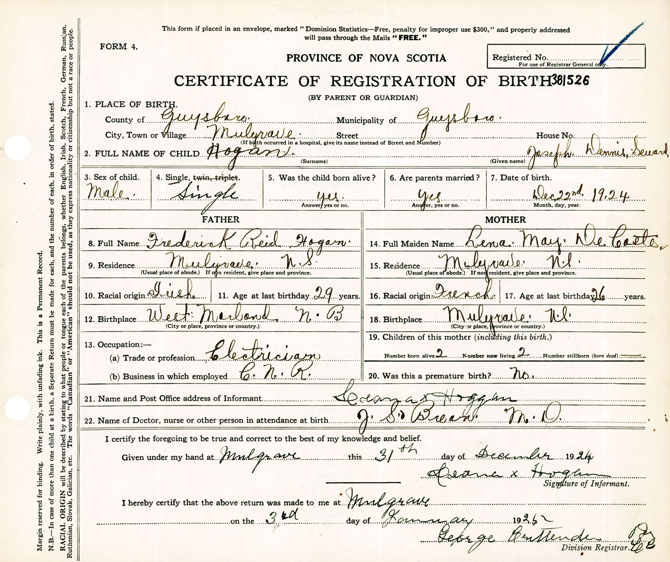 Male Birth Registration: Year: 1924 number: 38100526