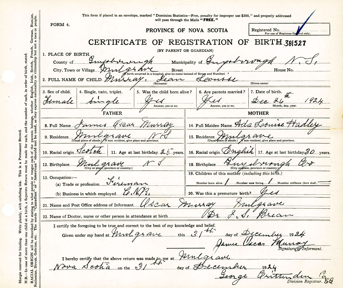 Female Birth Registration: Year: 1924 number: 38100527