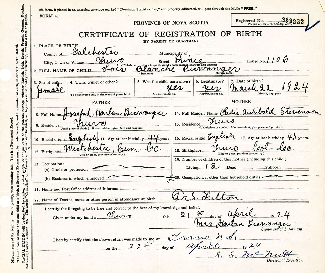 Female Birth Registration: Year: 1924 number: 38300232