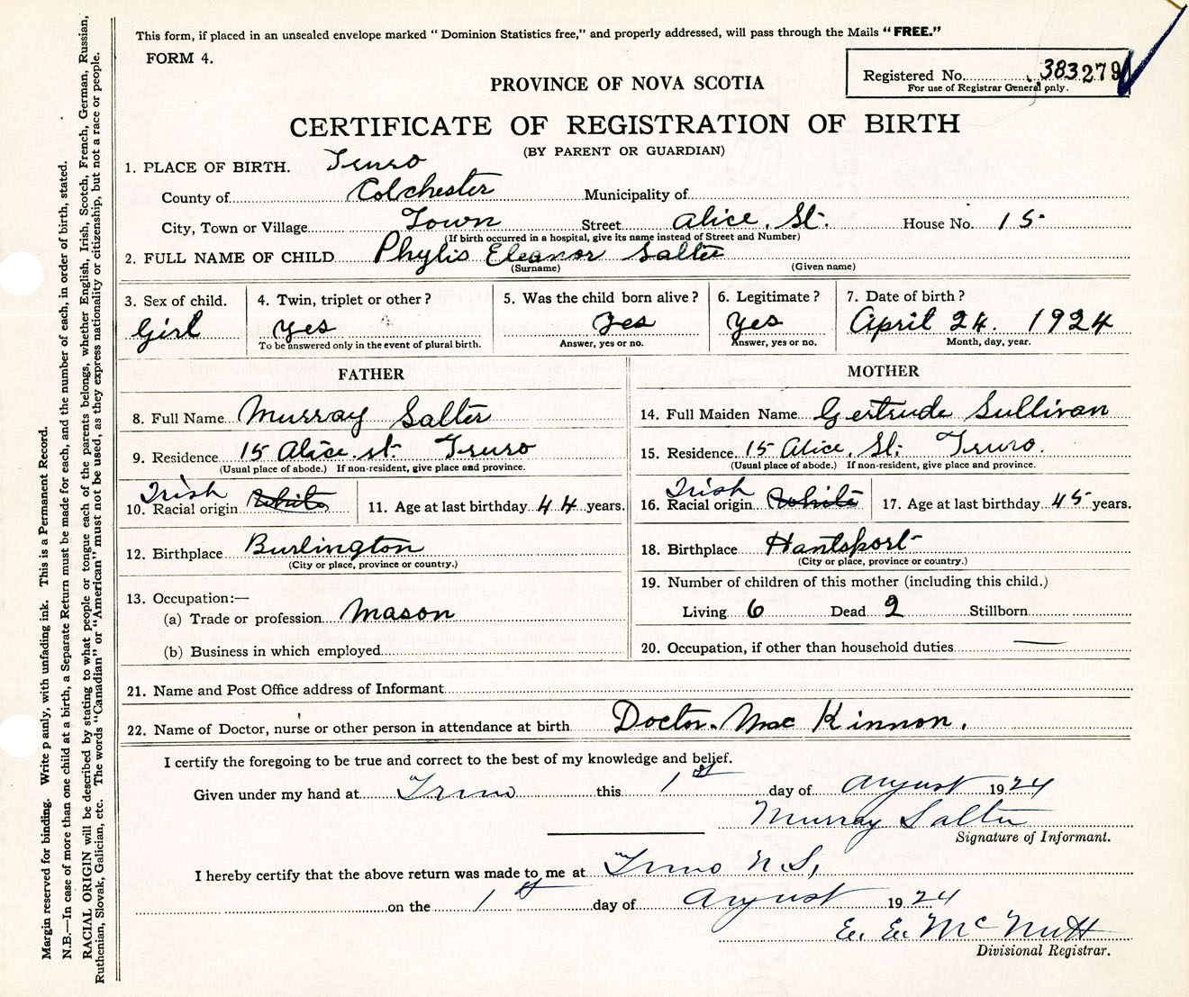 Female Birth Registration: Year: 1924 number: 38300279