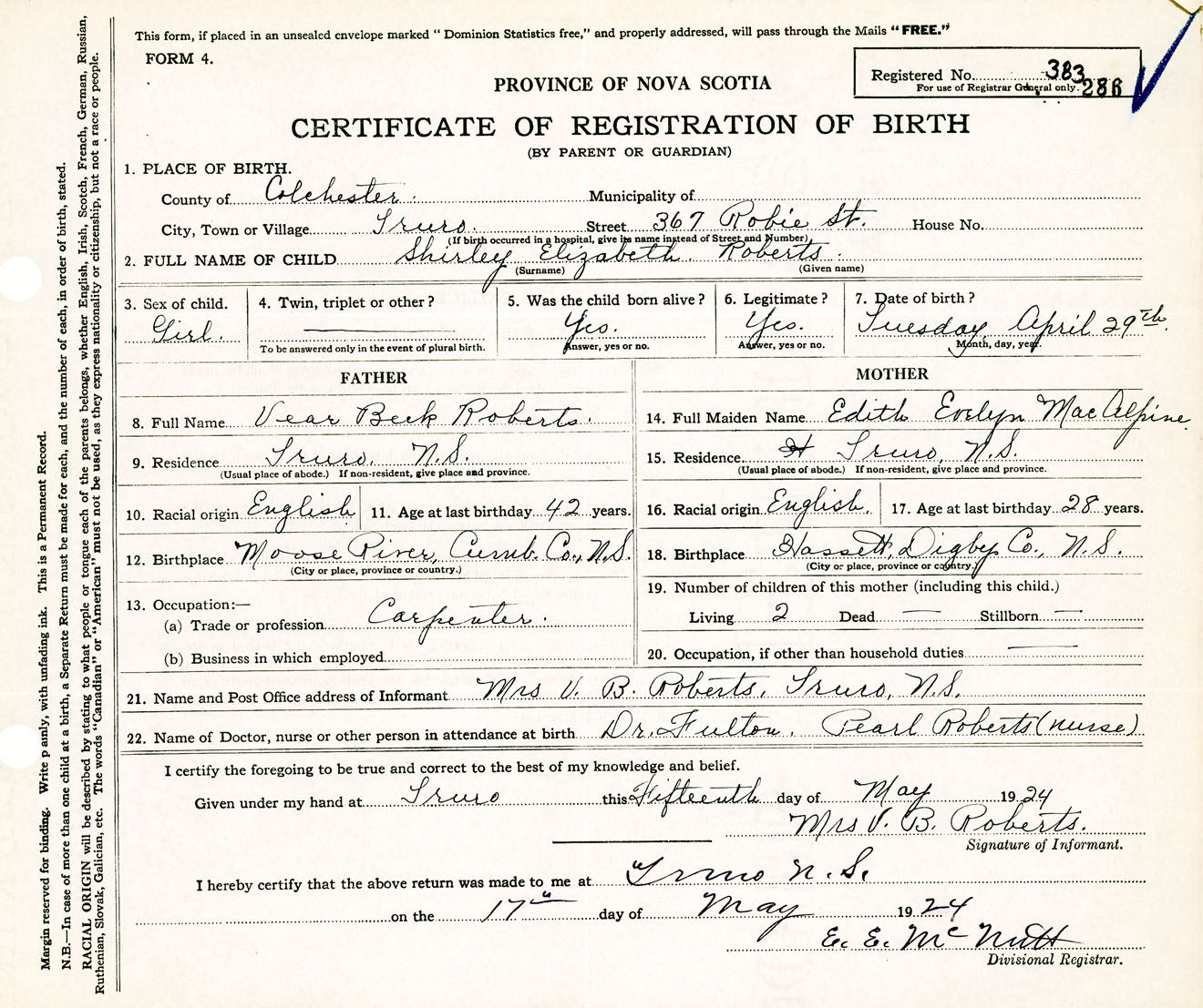 Female Birth Registration: Year: 1924 number: 38300286