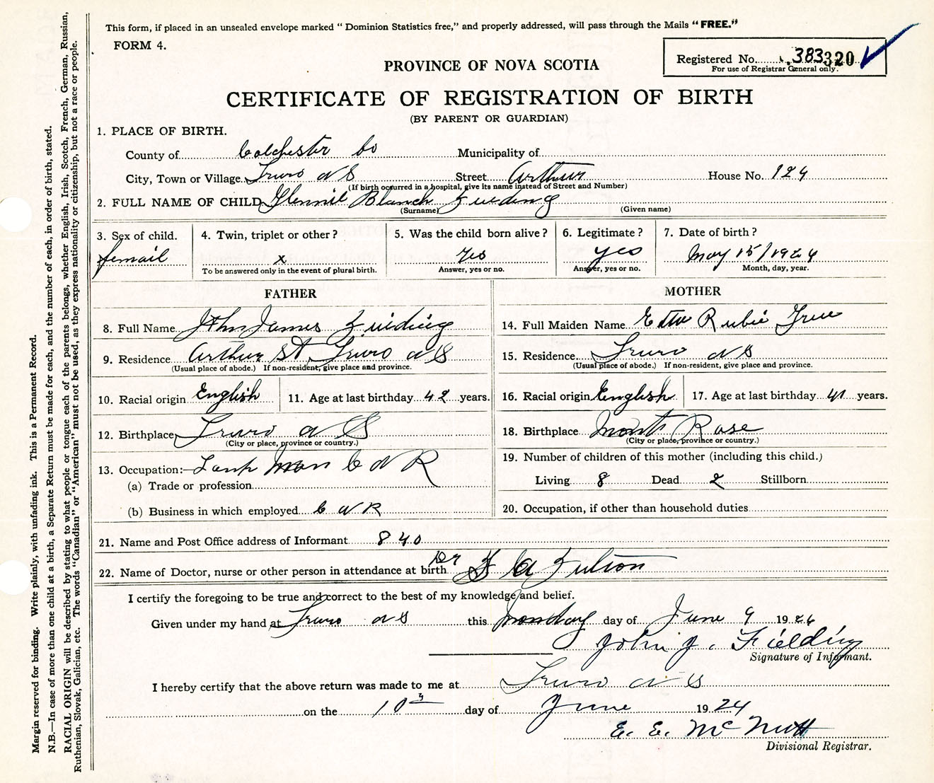 Female Birth Registration: Year: 1924 number: 38300320