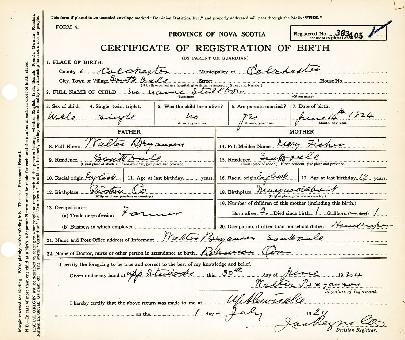 Male Birth Registration: Year: 1924 number: 38300405
