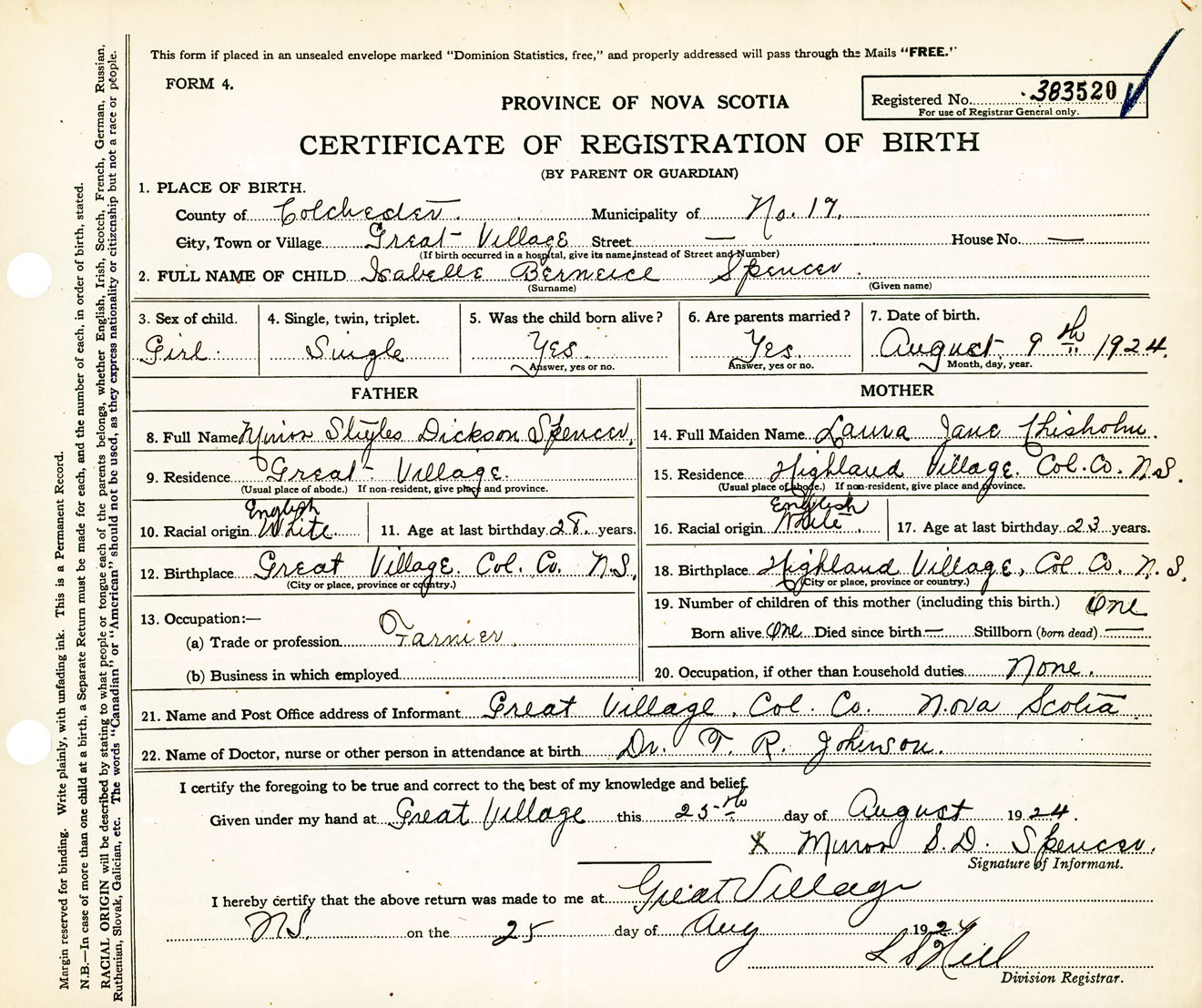 Female Birth Registration: Year: 1924 number: 38300520