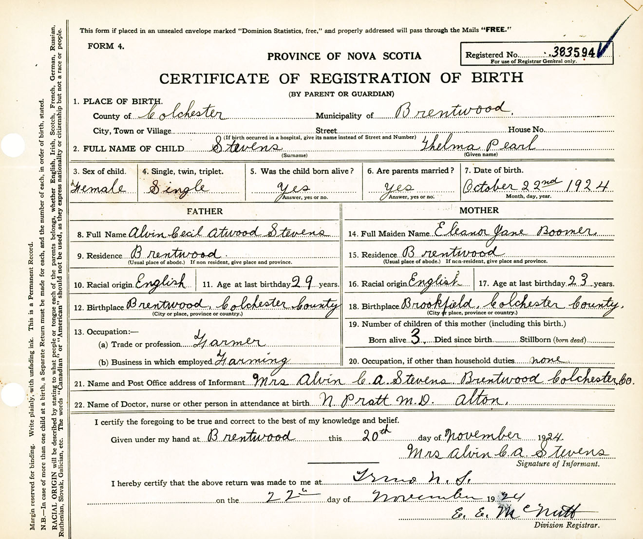 Female Birth Registration: Year: 1924 number: 38300594
