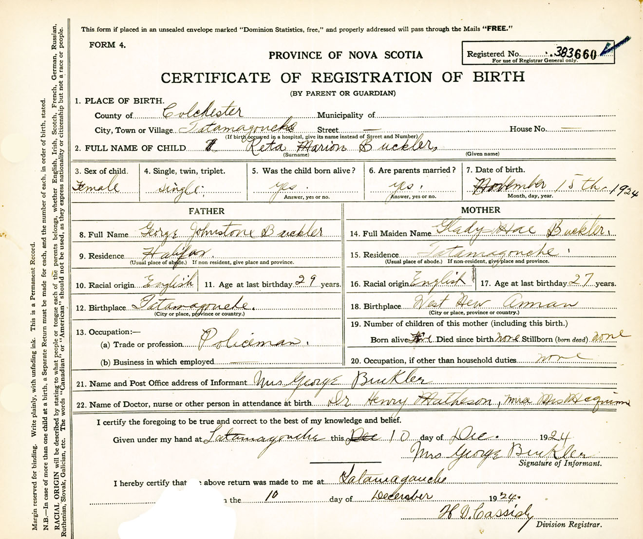 Female Birth Registration: Year: 1924 number: 38300660