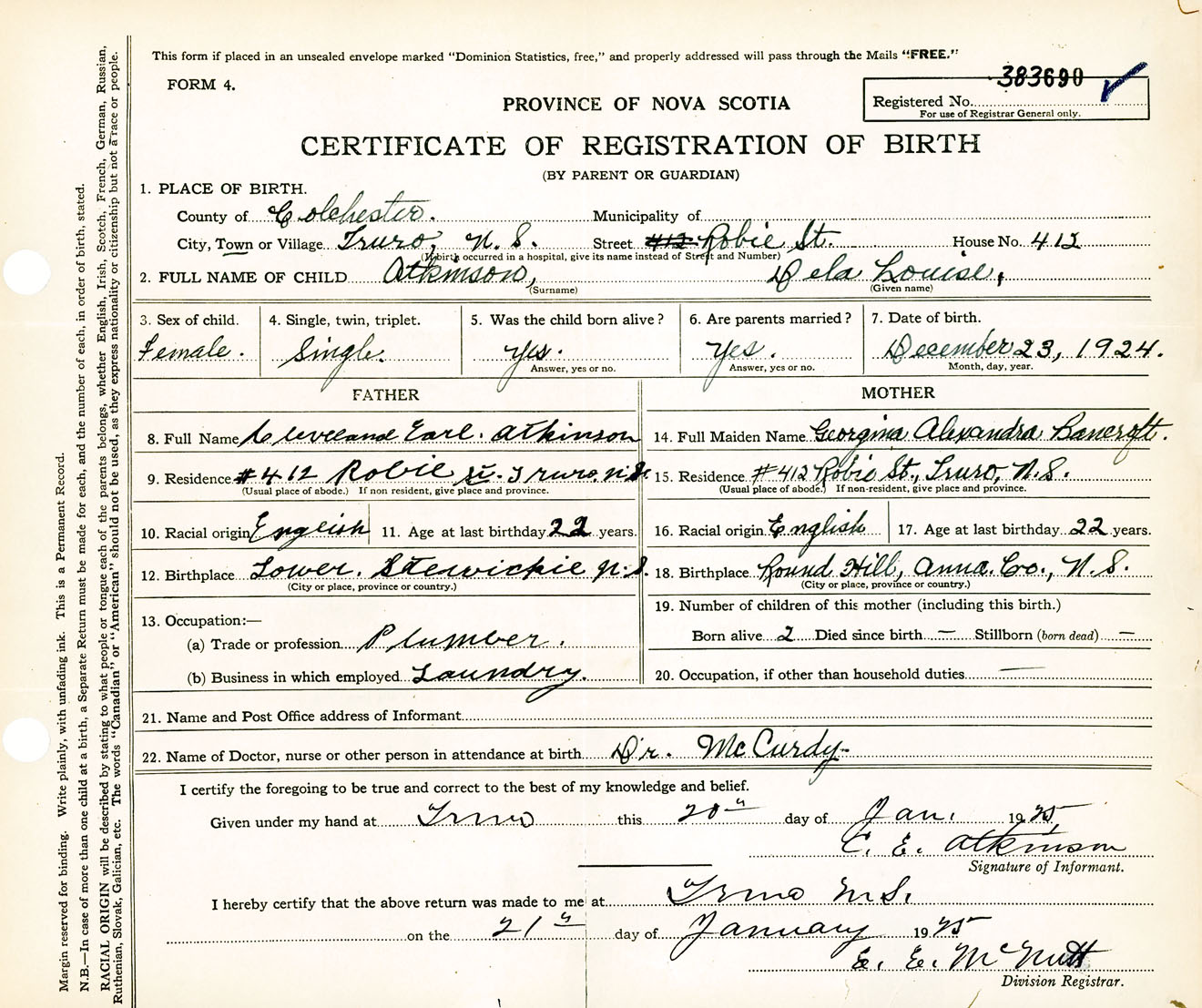 Female Birth Registration: Year: 1924 number: 38300690