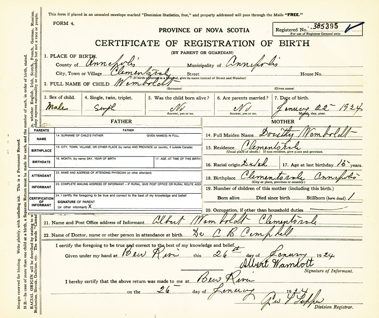 Male Birth Registration: Year: 1924 number: 38500395