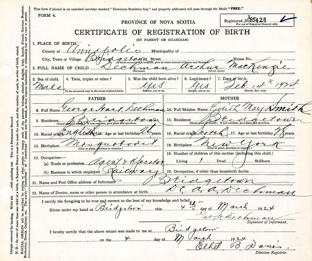 Male Birth Registration: Year: 1924 number: 38500426