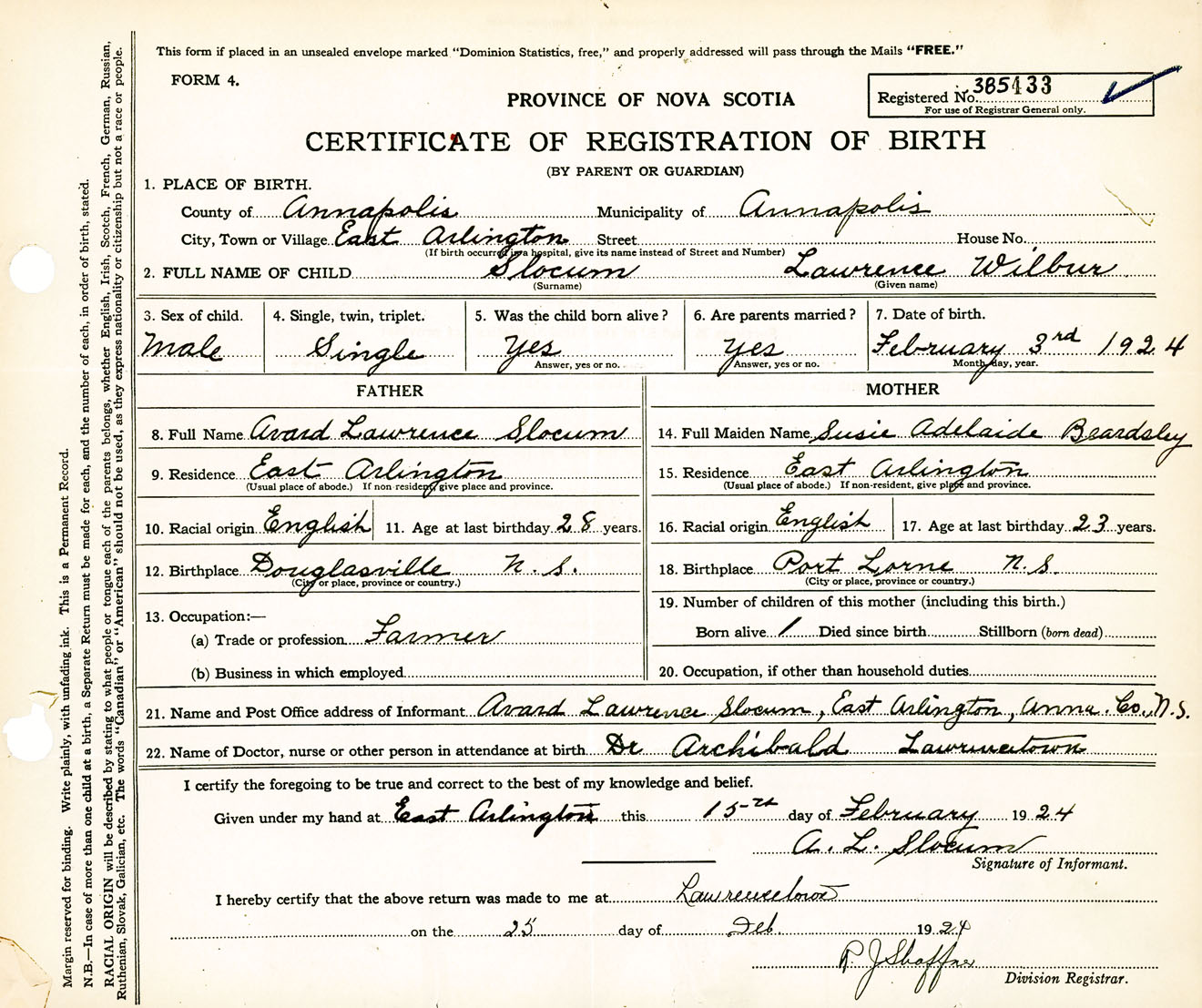 Male Birth Registration: Year: 1924 number: 38500433