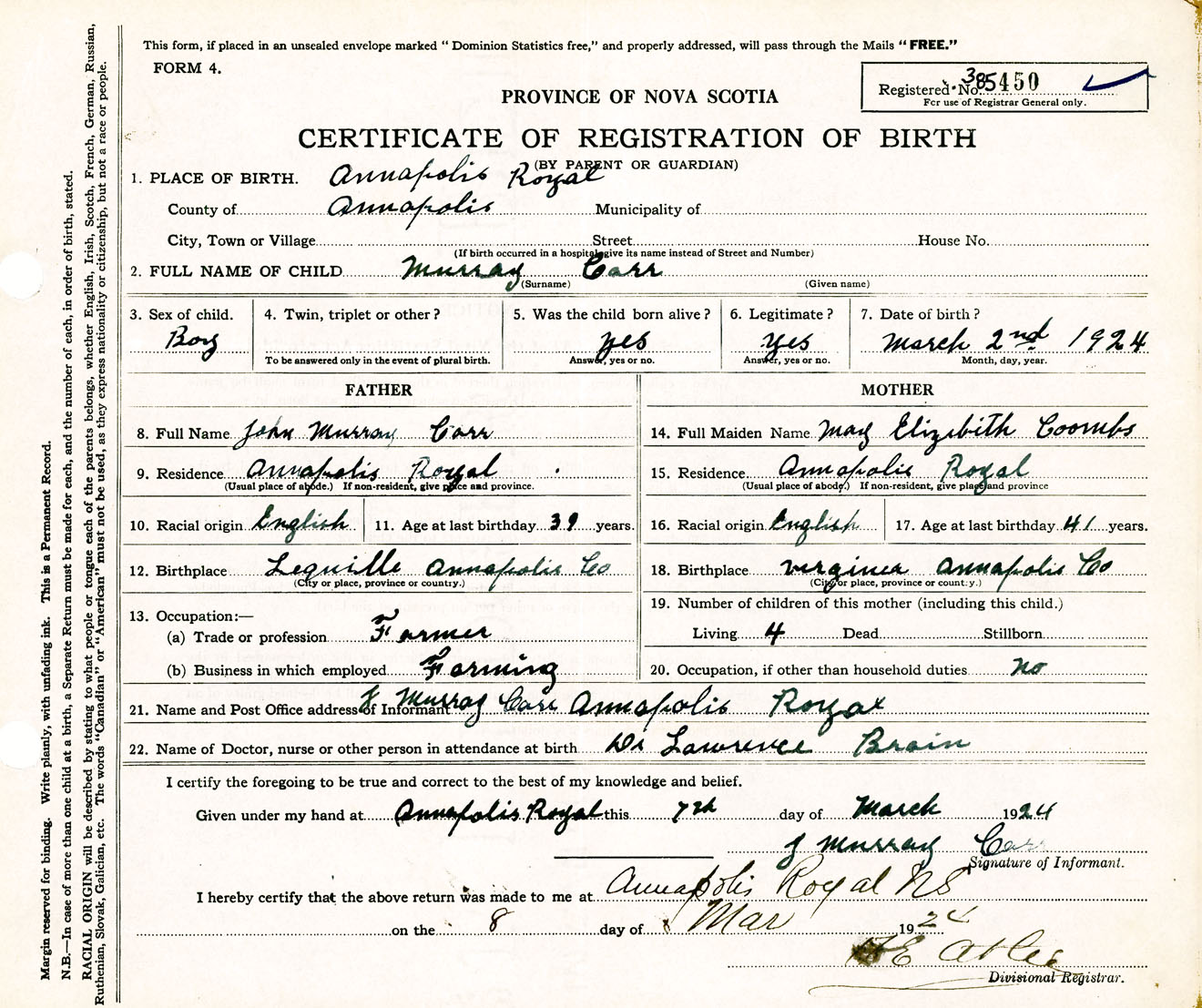 Male Birth Registration: Year: 1924 number: 38500450
