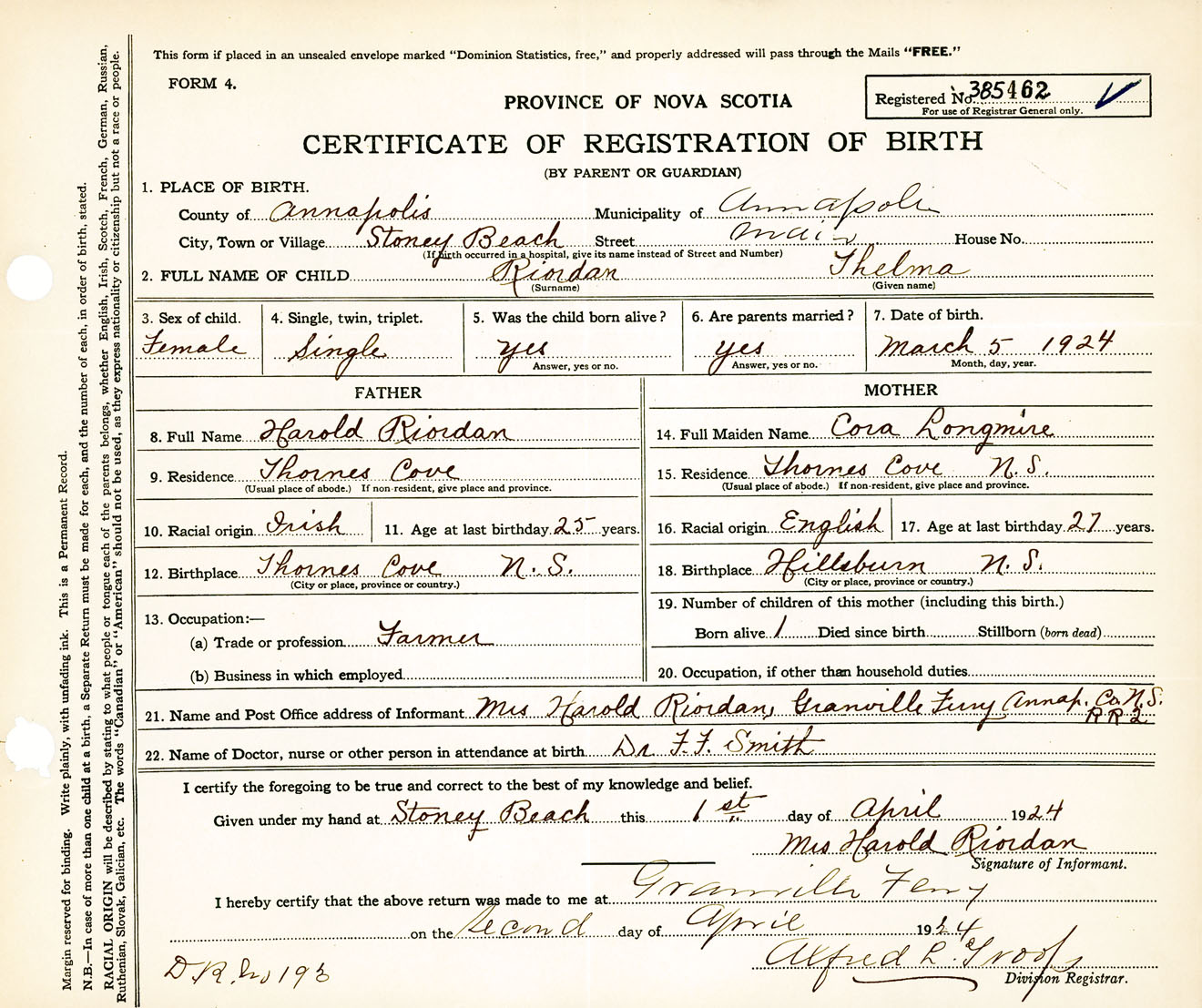 Female Birth Registration: Year: 1924 number: 38500462