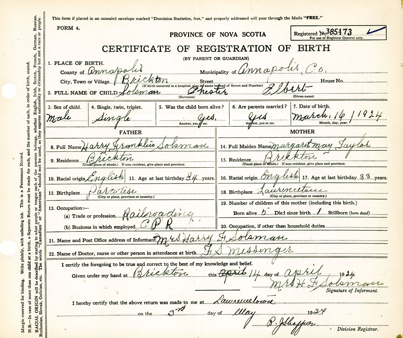 Male Birth Registration: Year: 1924 number: 38500473