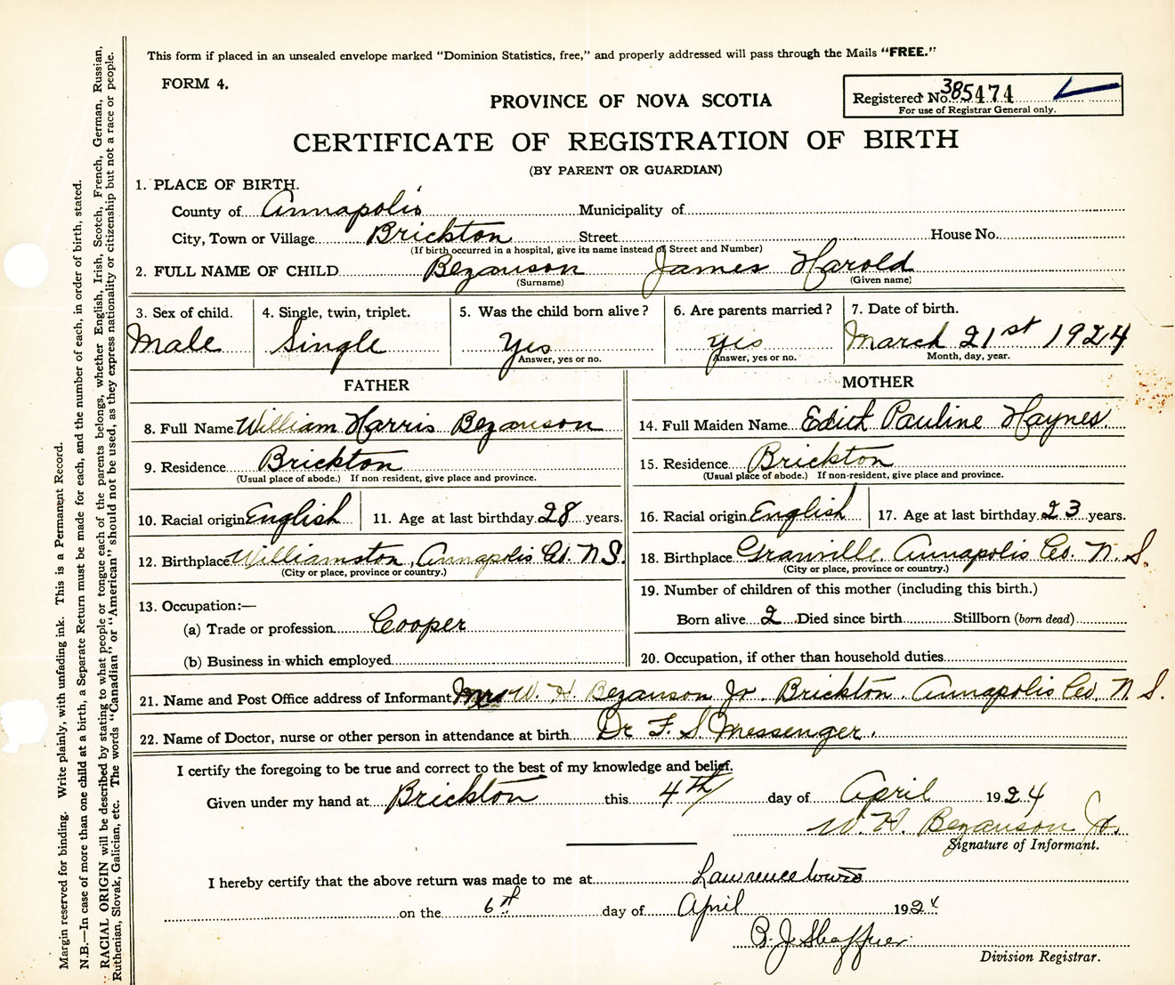 Male Birth Registration: Year: 1924 number: 38500474