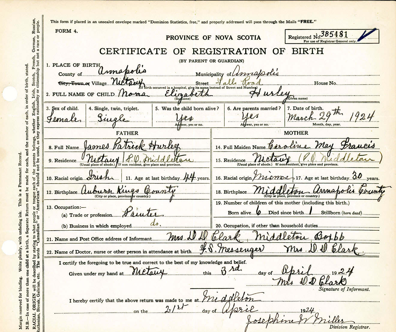 Female Birth Registration: Year: 1924 number: 38500481