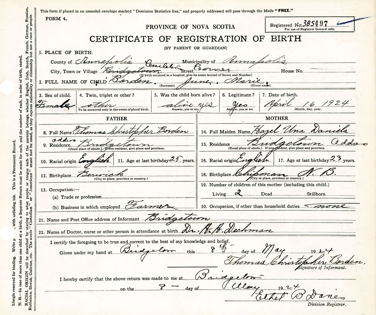 Female Birth Registration: Year: 1924 number: 38500497