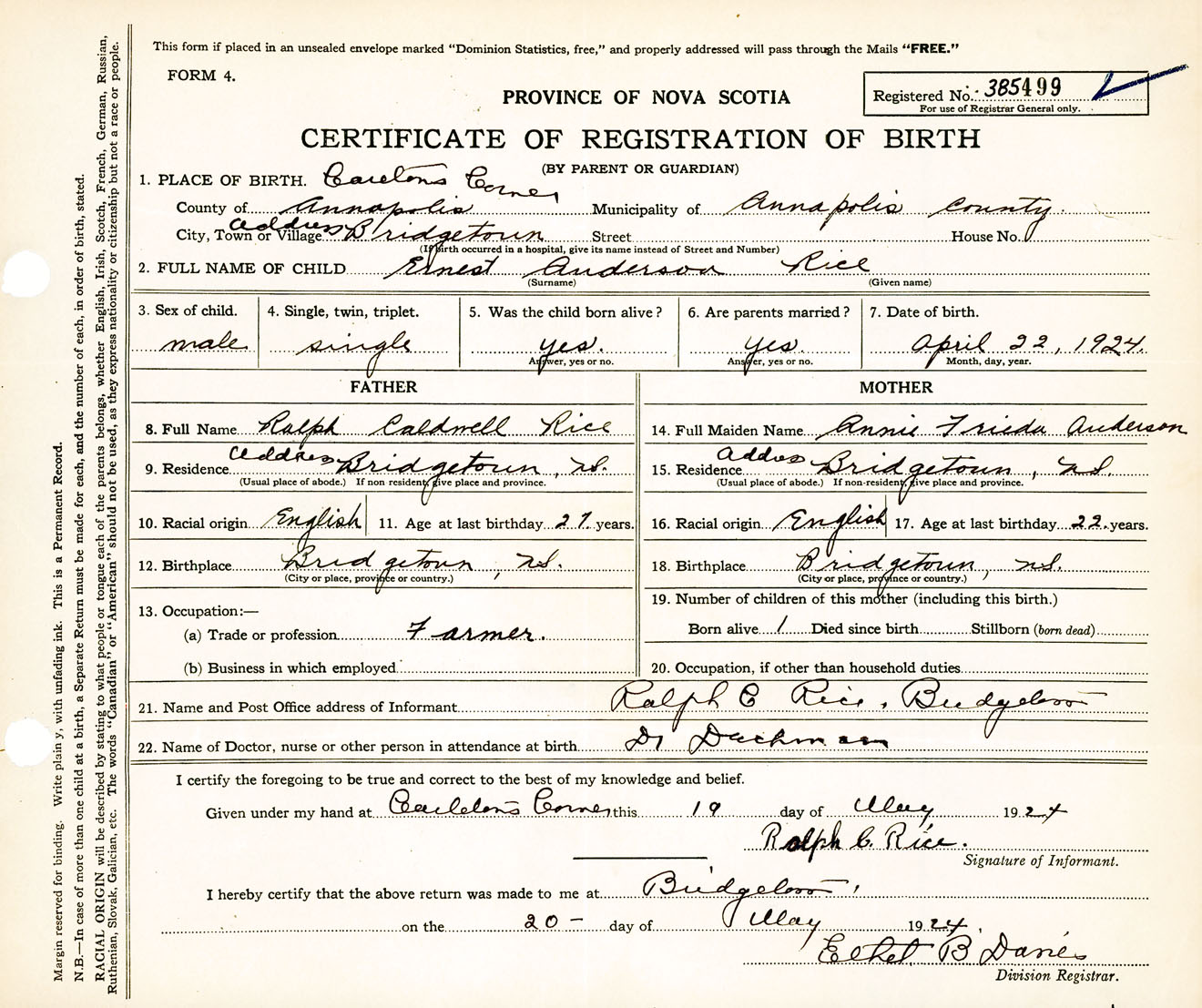 Male Birth Registration: Year: 1924 number: 38500499