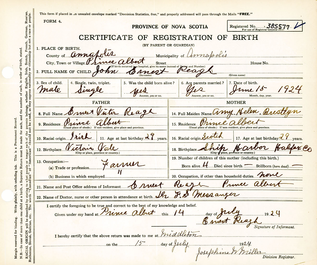 Male Birth Registration: Year: 1924 number: 38500577