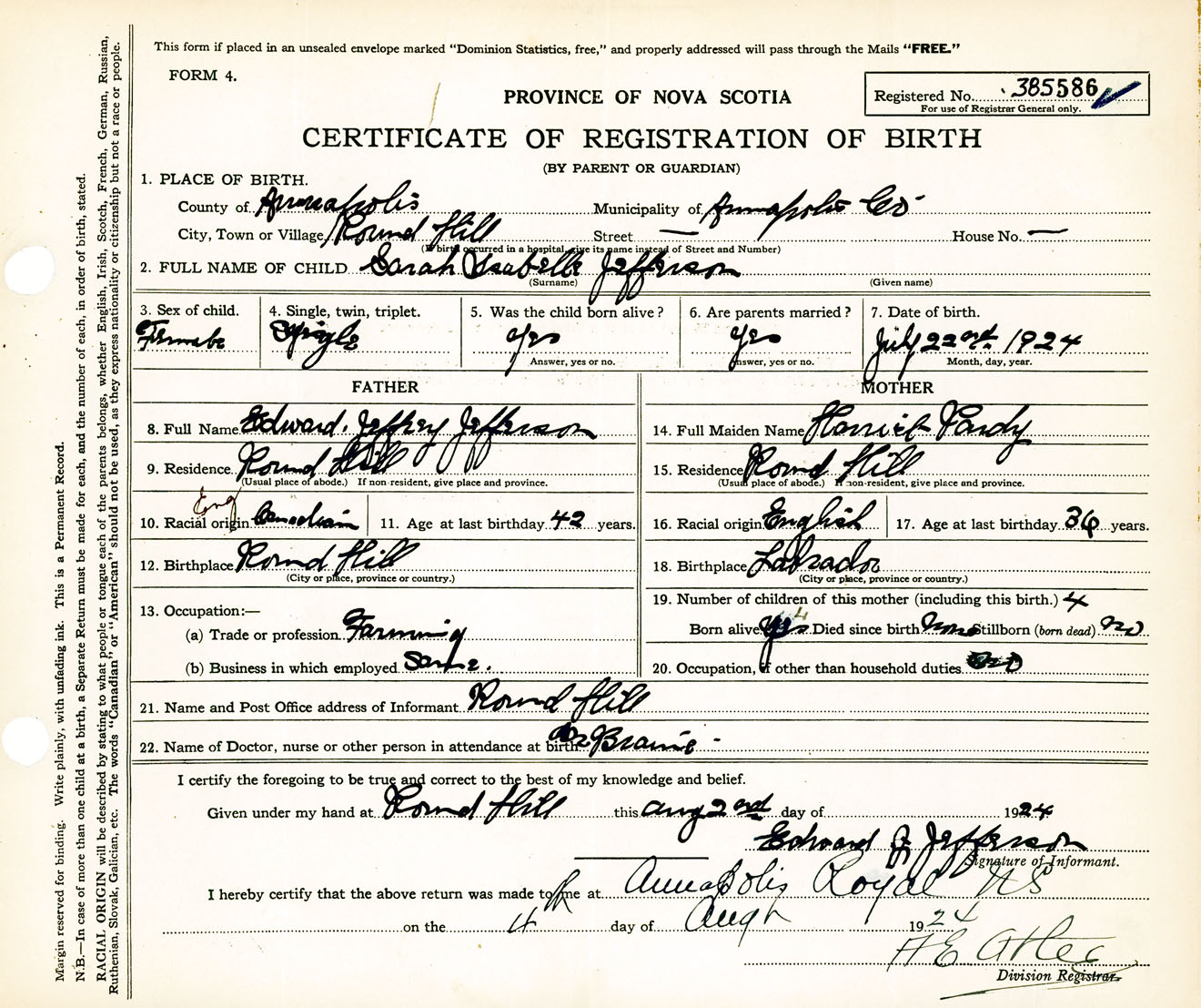 Female Birth Registration: Year: 1924 number: 38500586