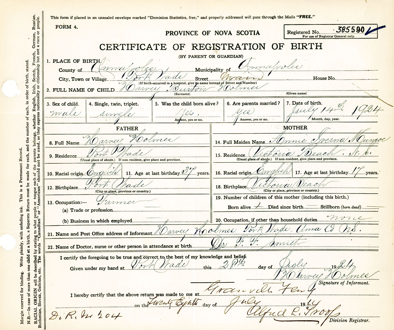 Male Birth Registration: Year: 1924 number: 38500590