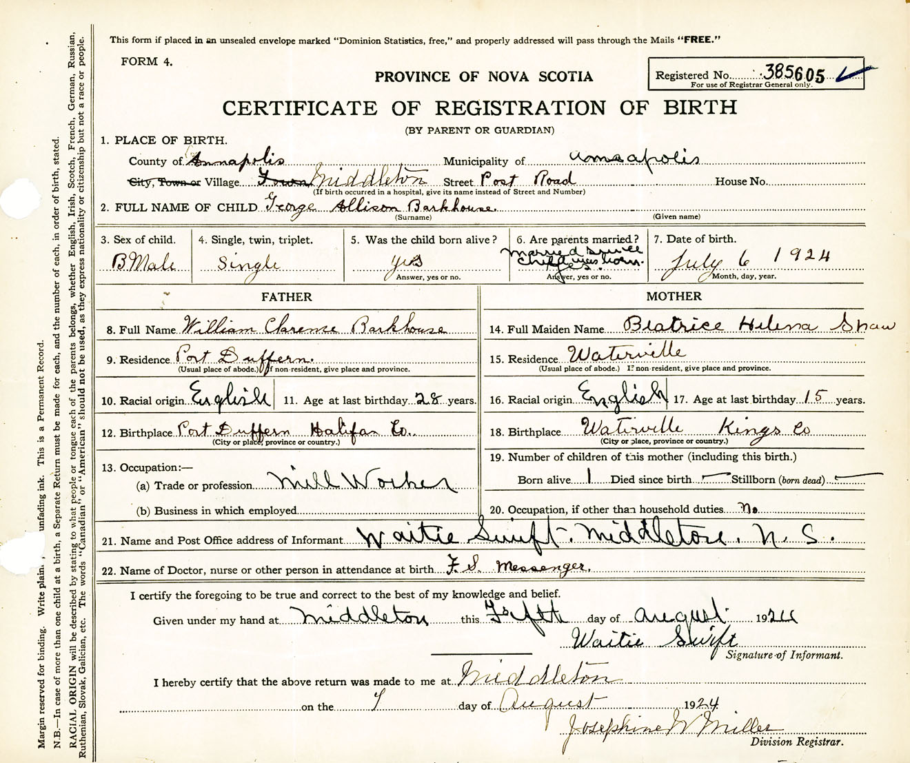 Male Birth Registration: Year: 1924 number: 38500605