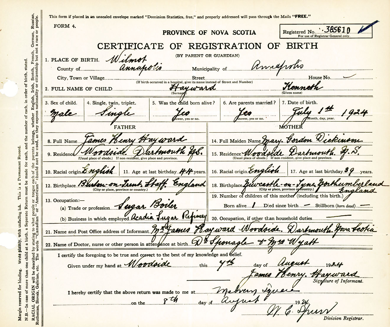 Male Birth Registration: Year: 1924 number: 38500610