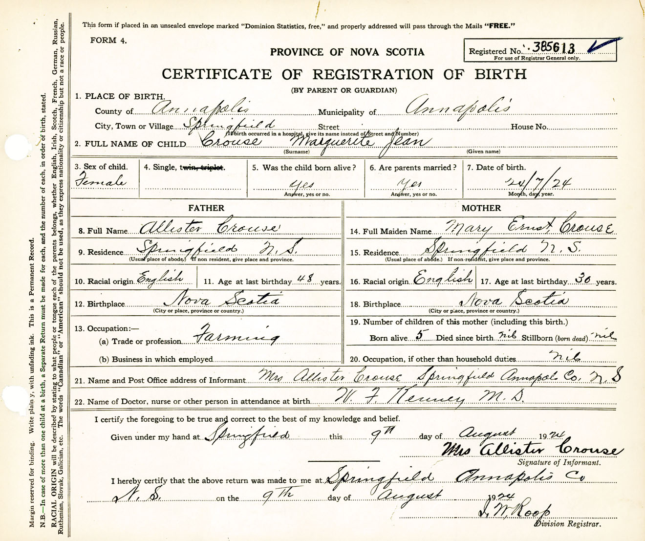 Female Birth Registration: Year: 1924 number: 38500613