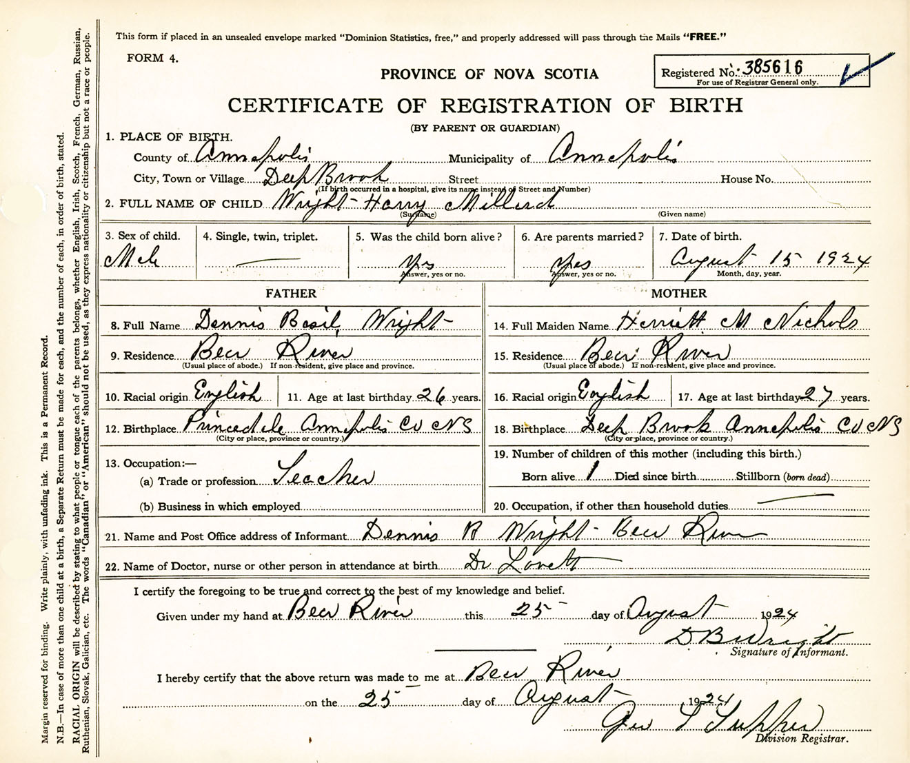 Male Birth Registration: Year: 1924 number: 38500616