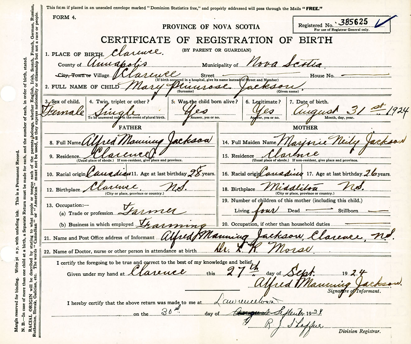 Female Birth Registration: Year: 1924 number: 38500625