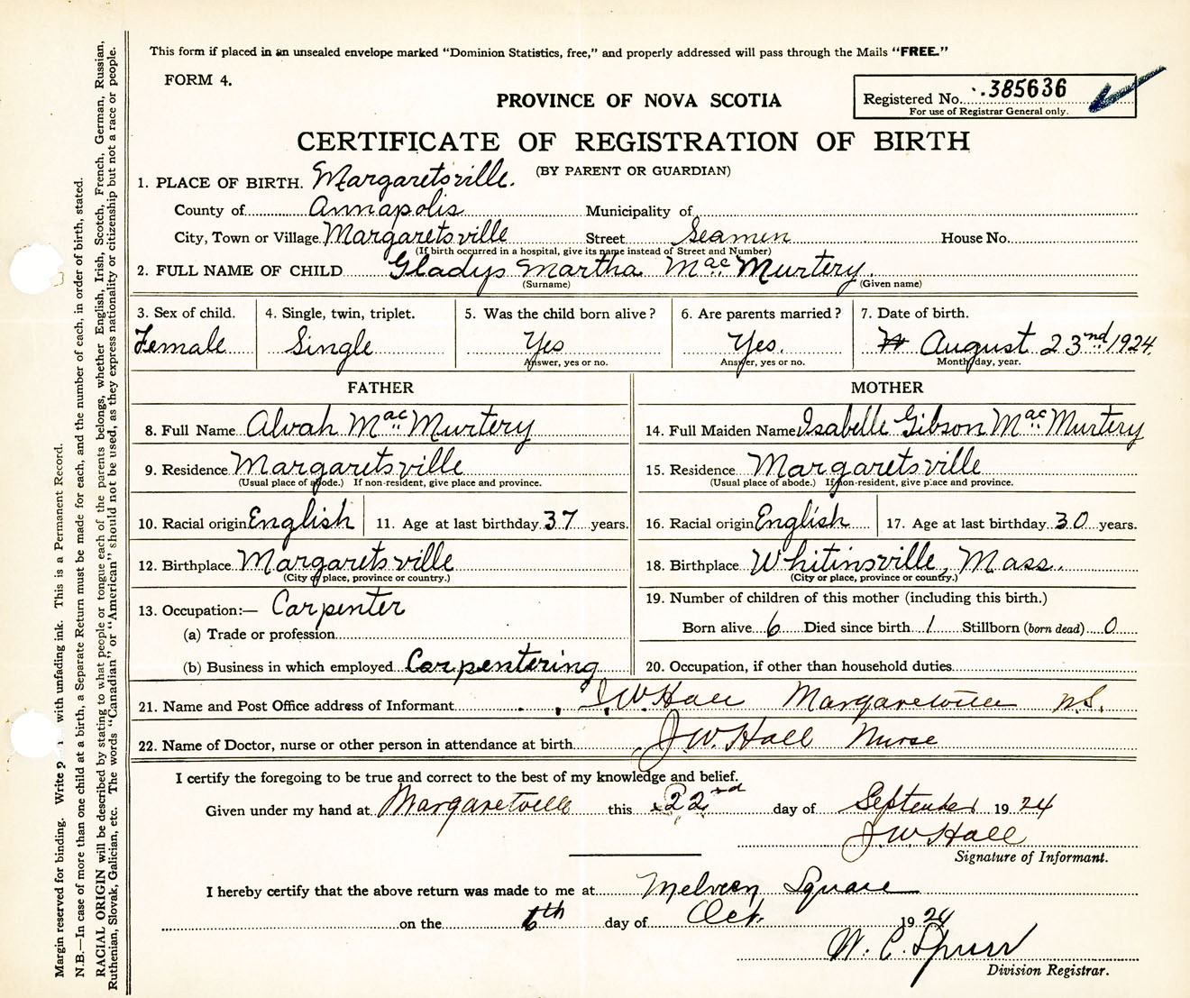 Female Birth Registration: Year: 1924 number: 38500636