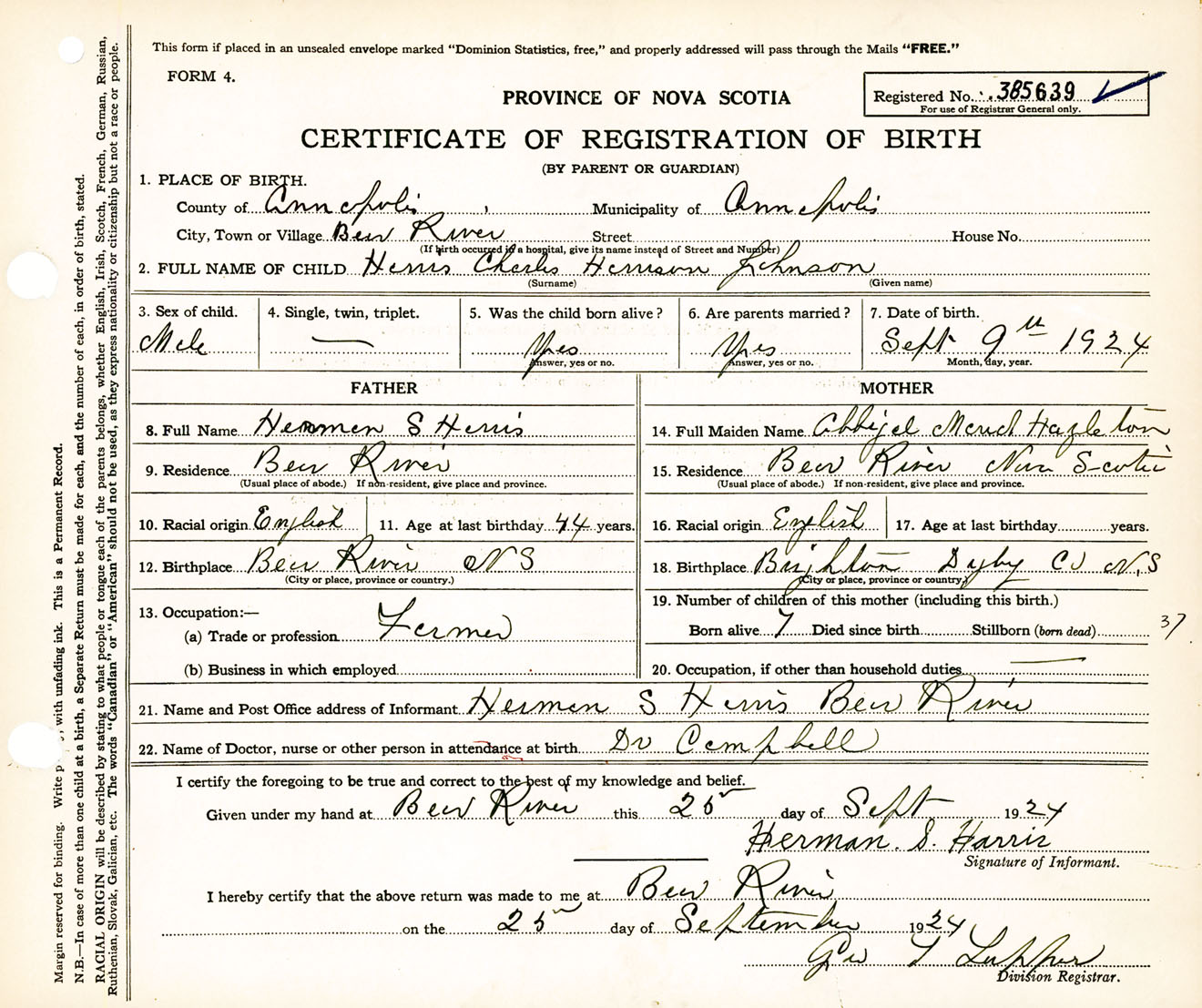 Male Birth Registration: Year: 1924 number: 38500639