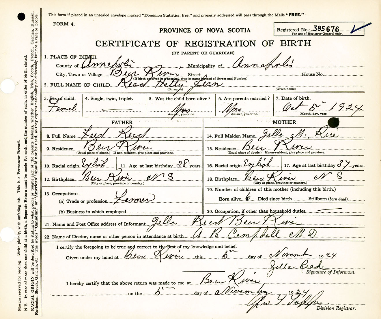 Female Birth Registration: Year: 1924 number: 38500676