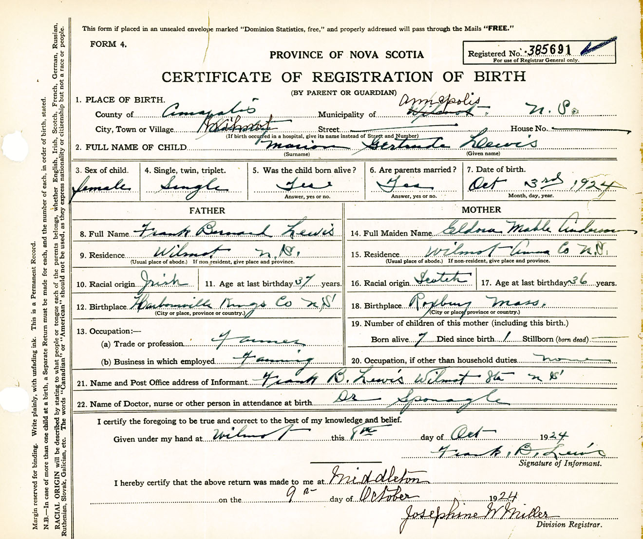 Female Birth Registration: Year: 1924 number: 38500691