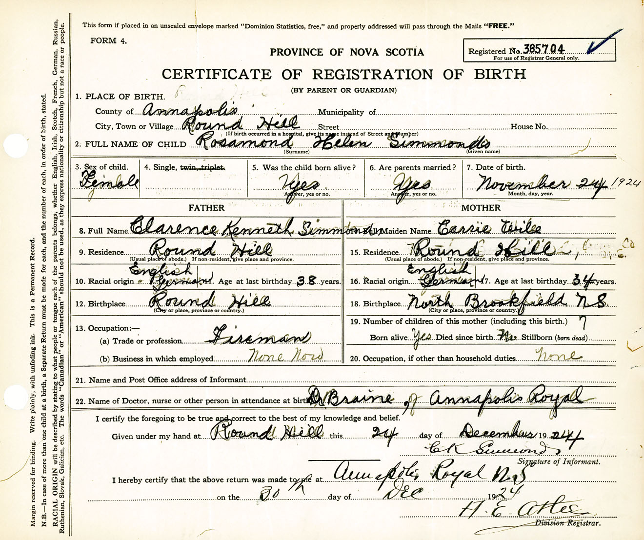Female Birth Registration: Year: 1924 number: 38500704