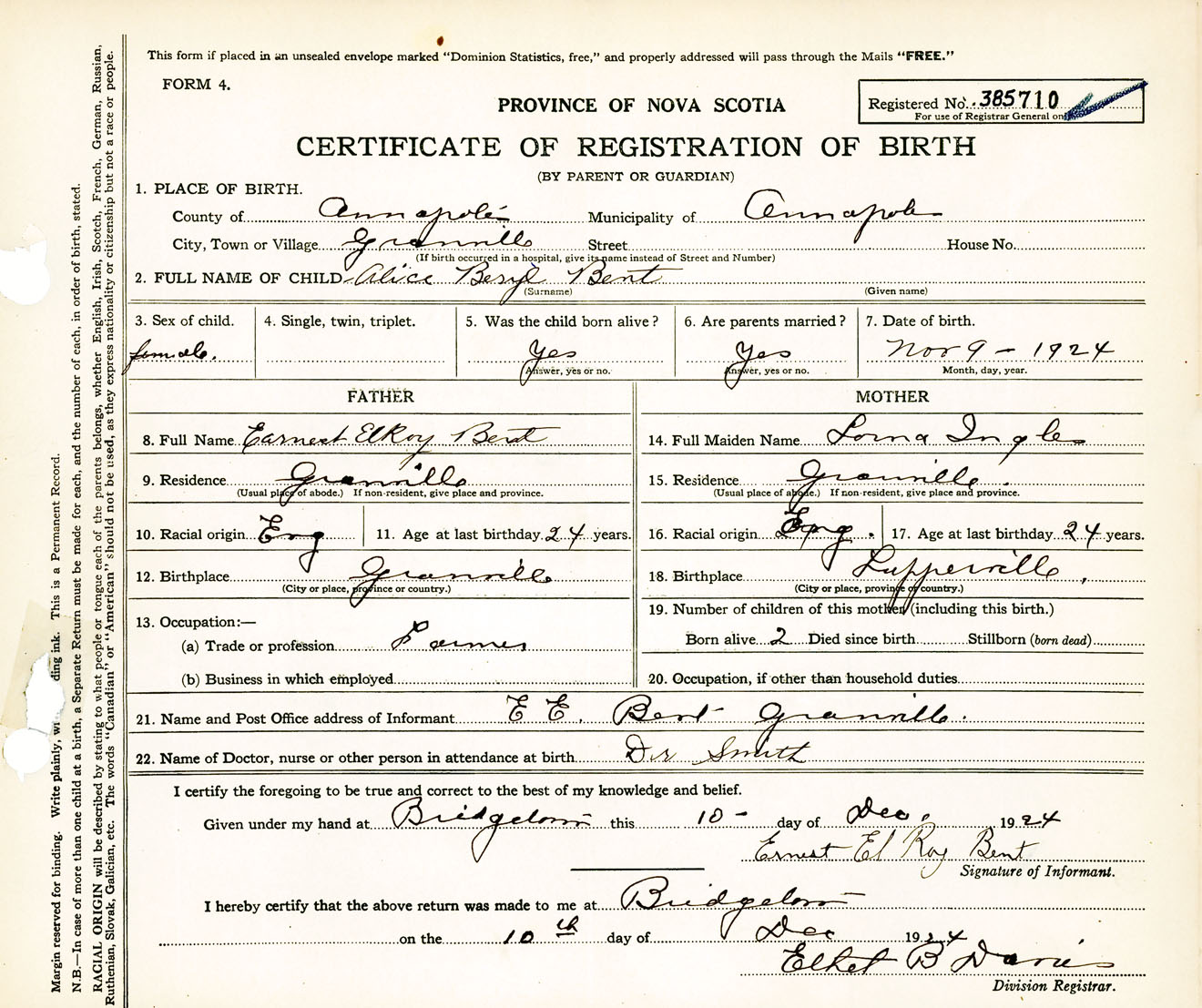 Female Birth Registration: Year: 1924 number: 38500710