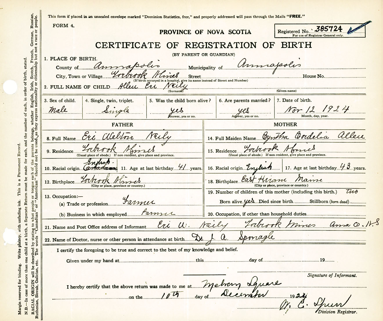 Male Birth Registration: Year: 1924 number: 38500724