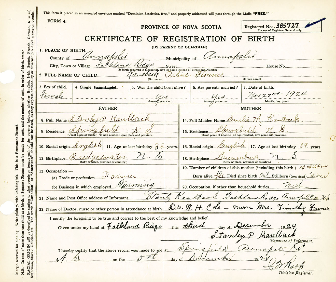 Female Birth Registration: Year: 1924 number: 38500727