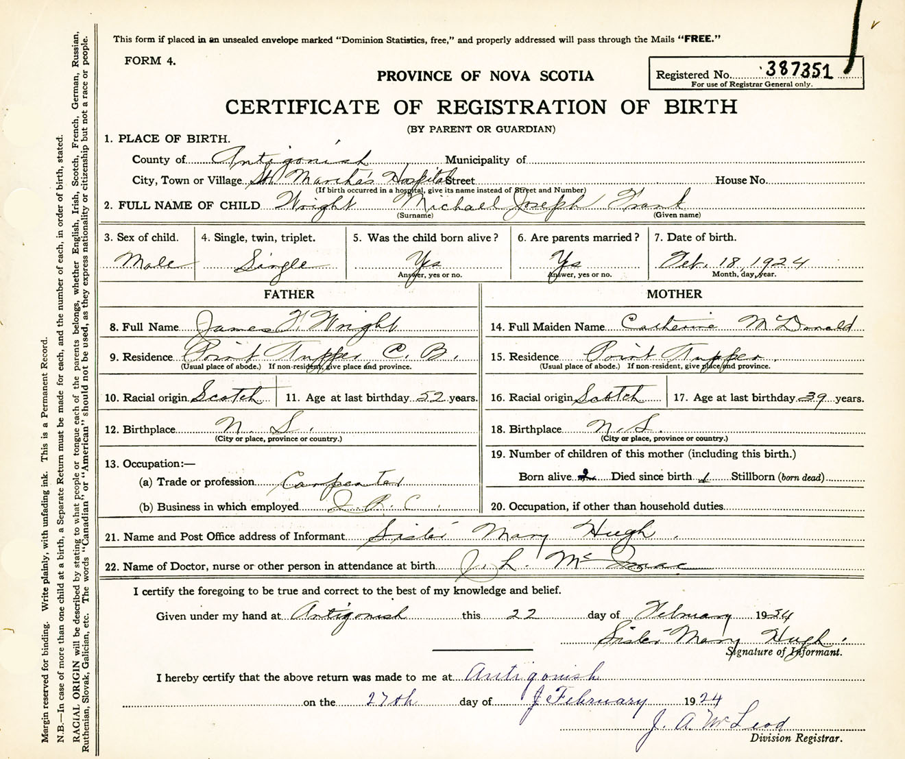 Male Birth Registration: Year: 1924 number: 38700351