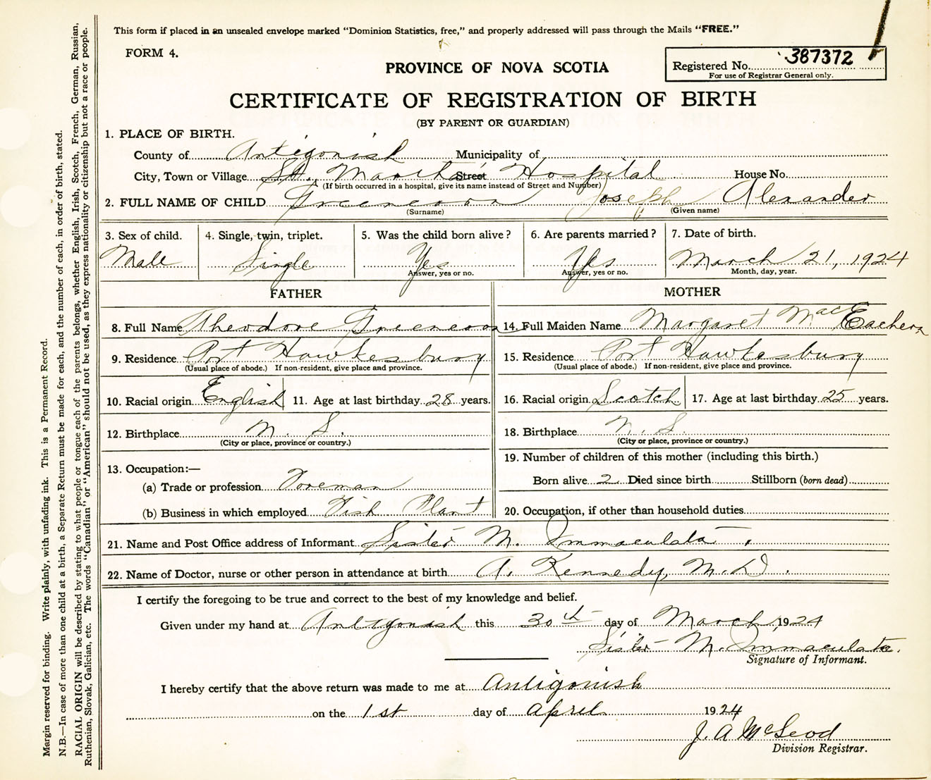 Male Birth Registration: Year: 1924 number: 38700372
